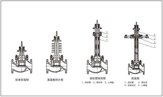 系列類型常溫型、中溫型、低溫型。波紋管密封型、夾套保溫型、調(diào)節(jié)切斷型