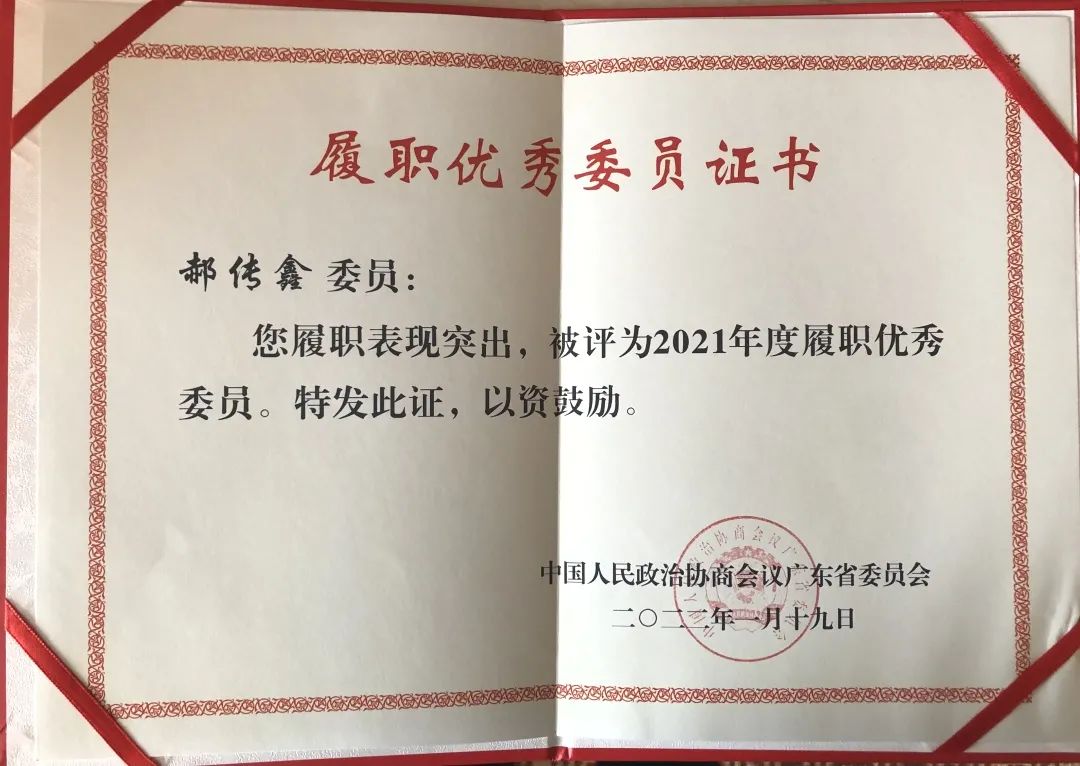 會上,廣東省政協對43件優秀提案、21名履職表現突出的委員予以表彰。廣東省新的社會階層人士聯合會副會長、中華全國專利代理師協會副會長、廣東專利代理協會會長、三環總經理郝傳鑫榮獲政協廣東省委員會“2021年度履職優秀委員”稱號。
