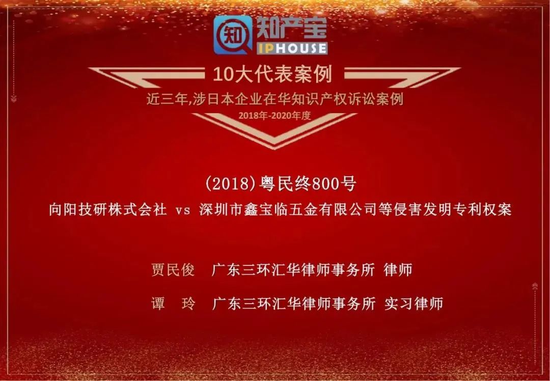 三環賈民俊律師、譚玲實習律師代理的向陽技研株式會社訴深圳市鑫寶臨五金有限公司等侵害發明專利案被評為“近三年,涉日本企業在華知識產權訴訟案例—10大代表案例”。