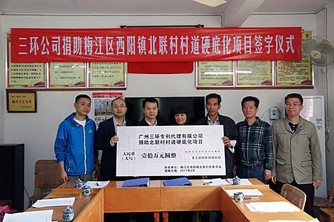 2017年4月,三環(huán)總經(jīng)理郝傳鑫赴梅州市梅江區(qū)北聯(lián)村,在廣州市知識(shí)產(chǎn)權(quán)局局長(zhǎng)鄧佑滿的見(jiàn)證下,與北聯(lián)村簽訂了“北聯(lián)村村道硬底化項(xiàng)目捐建協(xié)議”,捐助10萬(wàn)元,專(zhuān)項(xiàng)用于村道建設(shè)。該項(xiàng)目的實(shí)施,將實(shí)現(xiàn)全村所有自然村通水泥路,為村民出行和運(yùn)輸水果提供了出行方便,為北聯(lián)村實(shí)現(xiàn)脫貧打下了良好基礎(chǔ)。