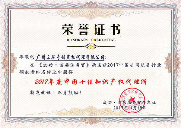 2017年11月18日,由《首席法務(wù)官》雜志牽頭主辦,中國(guó)首席法務(wù)官研究院和中國(guó)法治企業(yè)研究院協(xié)辦,旨在尋找中國(guó)公司法務(wù)行業(yè)的優(yōu)秀法務(wù)部門、標(biāo)桿律所以及杰出法務(wù)人員的評(píng)選活動(dòng)——《2017年度中國(guó)公司法務(wù)行業(yè)“領(lǐng)航者”十佳榜單》隆重舉行。經(jīng)過(guò)數(shù)月的網(wǎng)絡(luò)投票評(píng)選并綜合專家評(píng)審的專業(yè)意見(jiàn),最終評(píng)選出四個(gè)部門大獎(jiǎng)、四個(gè)人物大獎(jiǎng)以及兩個(gè)代理所大獎(jiǎng)。其中,廣州三環(huán)專利商標(biāo)代理有限公司光榮入選《2017年度中國(guó)十佳知識(shí)產(chǎn)權(quán)代理所》榜單。